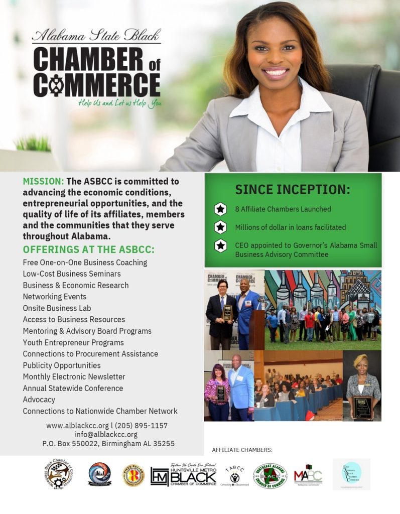 The ASBCC is committed to advancing the economic conditions, entrepreneurial opportunities, and the quality of life of its affiliates, members and the communities that they serve throughout Alabama.